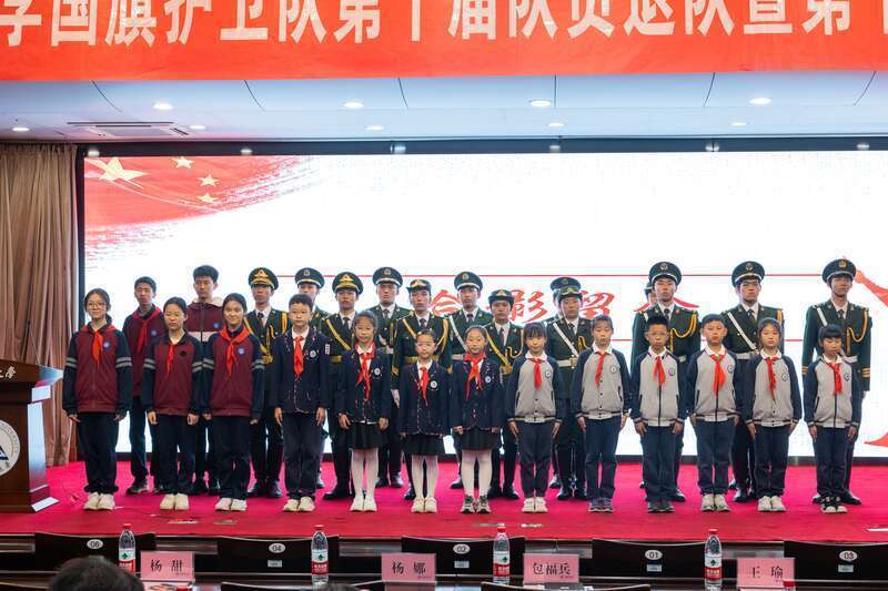 仪式现场,“接旗”“挥刀”的口令响起,指挥刀与队旗交接环节庄重而热烈。一递一接之间,传递的不仅是护旗任务,更是“忠诚、纪律、奉献、荣誉”的精神内核。随后,全体人员观看“成长之路”视频,重温队员训练的汗水与蜕变;新队员将青春誓言与护旗理想投入“时光信箱”,定格初心;规范利落的军刀礼展示,展现出国旗护卫队昂扬过硬的专业素质;家长与老队员的寄语视频温情真挚,让跨越代际的精神力量在现场流淌。