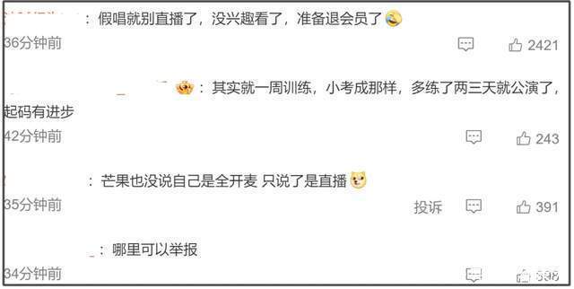 本来姐姐们的唱功就一般,还以为能听到姐姐们全开麦的真唱,看到她们的成长,结果公演变成了对口型假唱,这还有什么乐趣,观众直接喊话退钱!还说平台涉嫌欺诈。